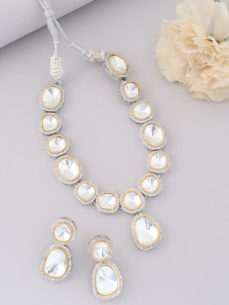 This necklace is the ultimate accessory option for the festive season. This set has a gorgeous circular floral pattern. The necklace has vibrant pearl detailing all over. The set also has a bright element of Kundan detailing in its structure. So, don't miss out on this gorgeous necklace set this eventful season as you have ramps to walk ahead.