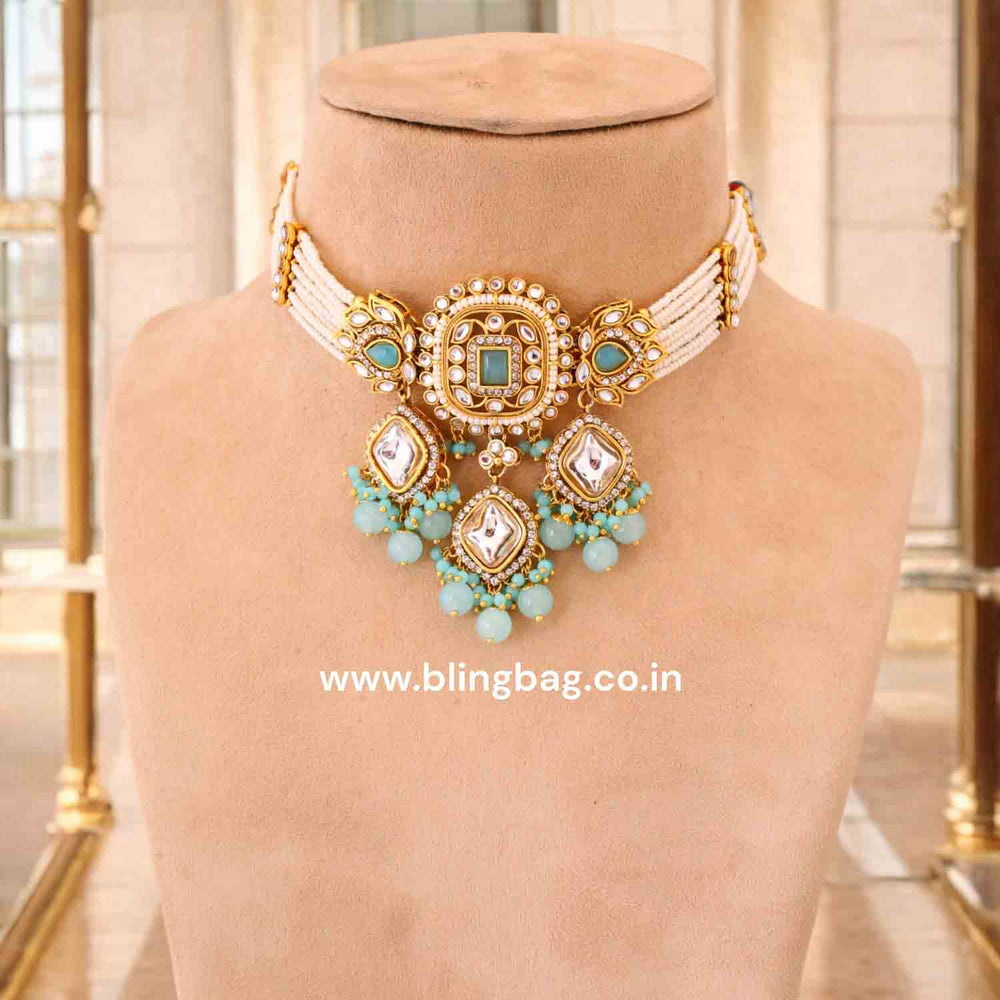 This necklace is the ultimate accessory option for the festive season. This set has a gorgeous circular floral pattern. The necklace has vibrant pearl detailing all over. The set also has a bright element of Kundan detailing in its structure. So, don't miss out on this gorgeous necklace set this eventful season as you have ramps to walk ahead.